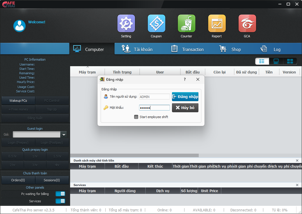 Chuyên dành cho Nhân Viên Trông Cửa Hàng giúp quản lý doanh thu, dịch vụ, tài khoản thành viên, kho, hàng tồn, thiết lập web cấm, phần mềm cấm dành cho máy trạm, giao ca nhân viên.....tương tác giữa nhân viên và khách hàng, order dịch vụ, chat, remote máy trạm sửa lỗi...