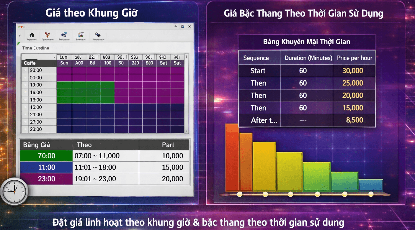 GCafe có gói Free hoàn toàn miễn phí và không giới hạn số lượng PC sử dụng, bao gồm đầy đủ các phần mềm:
