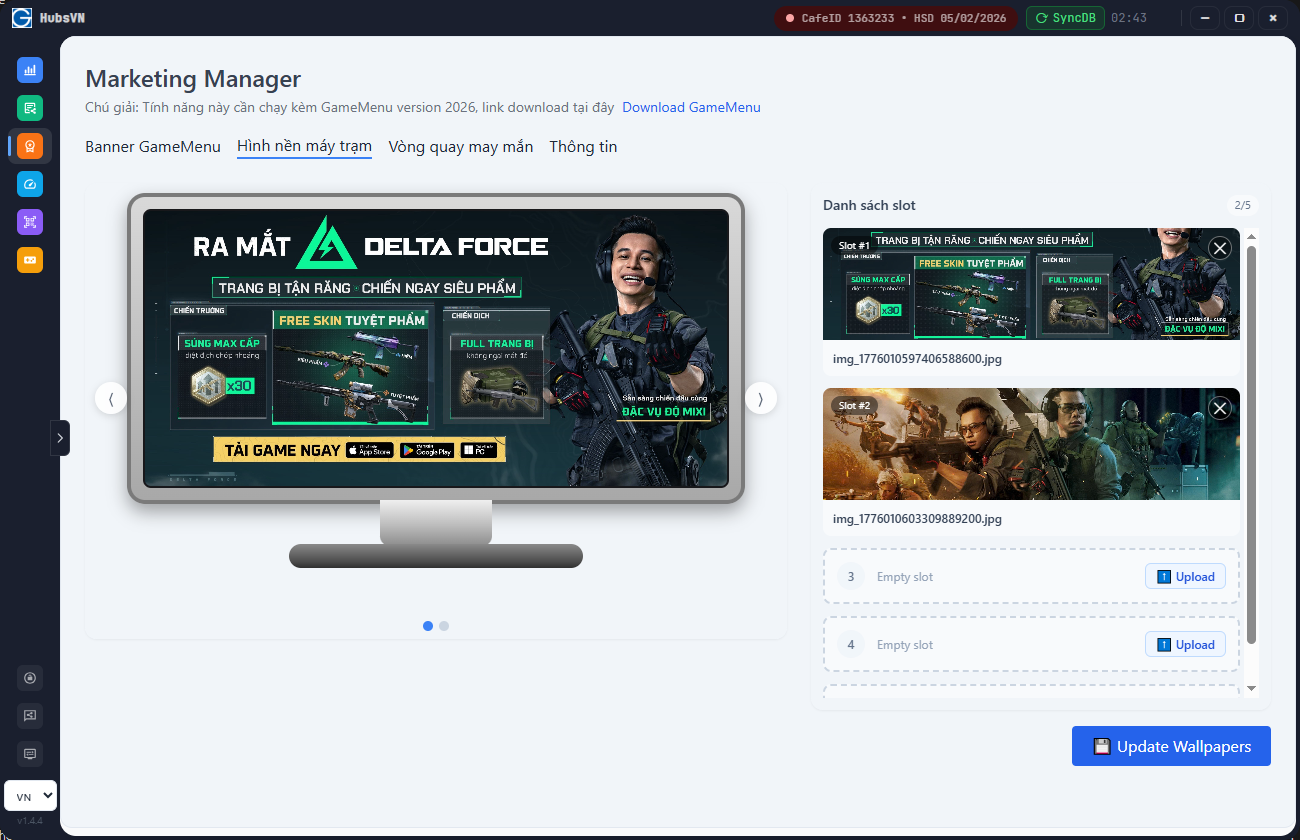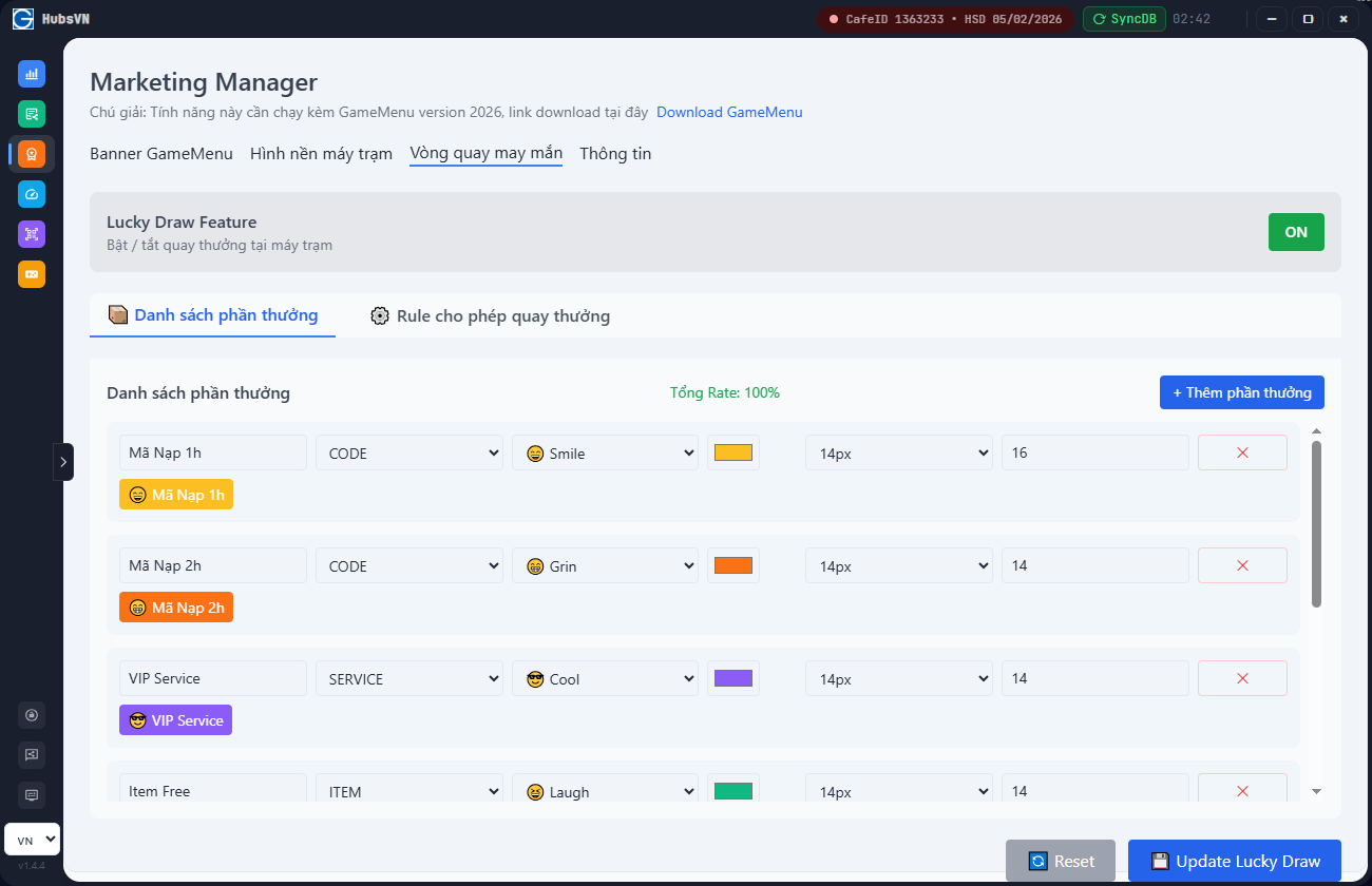 Độc quyền chỉ có bởi HubsVN (GCafe) Mang đến các chính sách trong game cho người chơi nhằm gia tăng vật phẩm, lợi ích nhận được trong game so với các Phòng máy khác