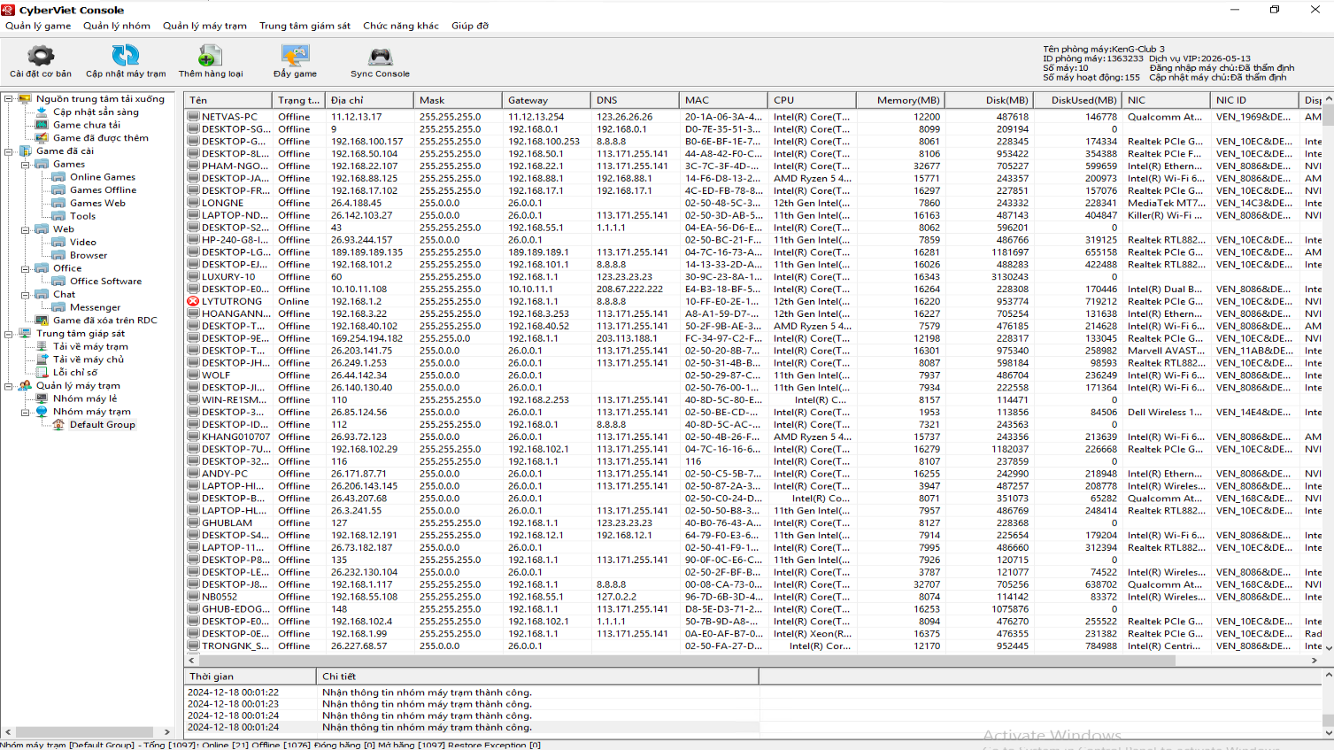- Cập nhật sẵn sàng : Hiển thị danh sách game có update nhưng phần mềm chưa đẩy file update xuống cho phòng máy.
